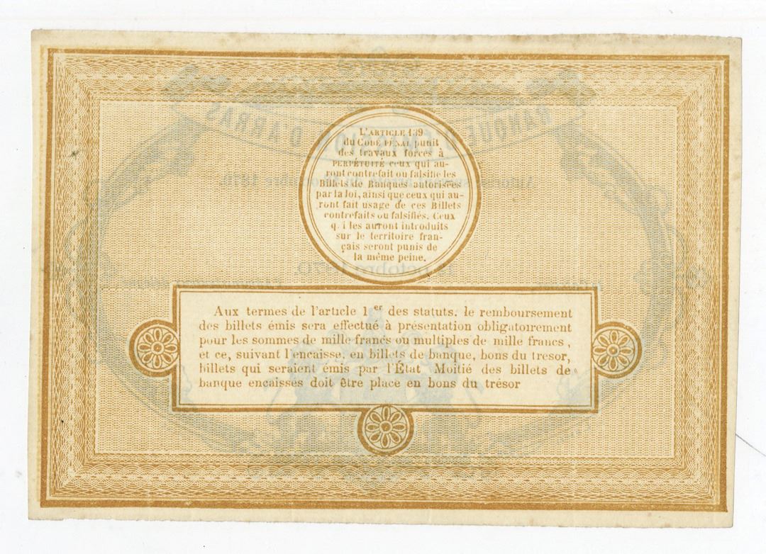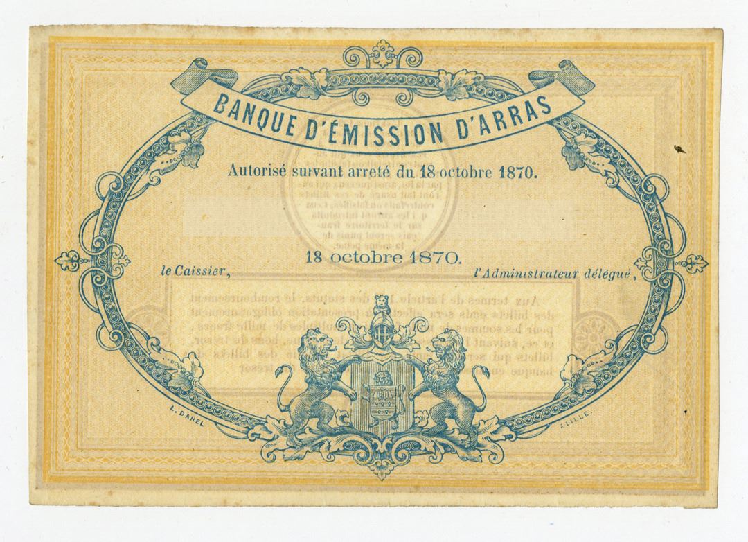 France. October 18, 1870. P-Unlisted, Remainder banknote, Blue and yellow on face, PMG graded Choice Uncirculated 64. Possibly used for fiscal banking business.