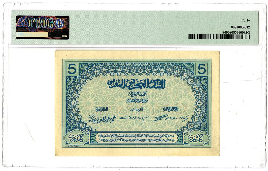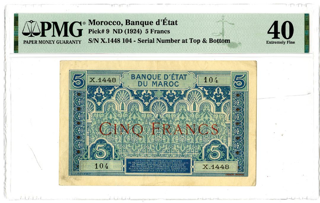 Morocco. ND (1924). 5 Francs, P-9, Issued banknote, Blue on face, S/N X.1448 104 - Serial Number at Top & Bottom, PMG graded Extremely Fine 40.