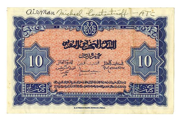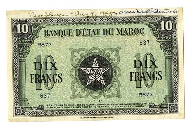 Issued 10 Francs, 1944, P-25a, annotated in margin "Casablanca - Aug 8, 1945 - Airman Michael Constantinoff"