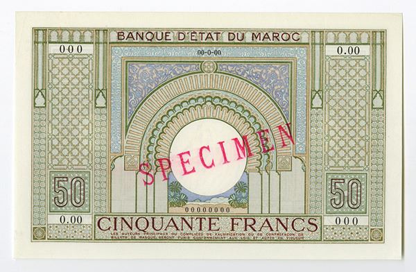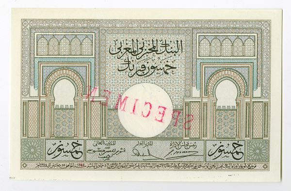 Morocco, specimen 50 Francs, P-21s, overprinted SPECIMEN, S/N O.00 00000000, and dated 00-0-00. About to Choice Uncirculated. Rare in this form.