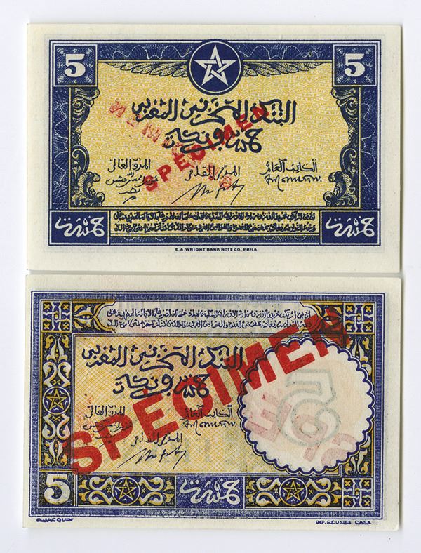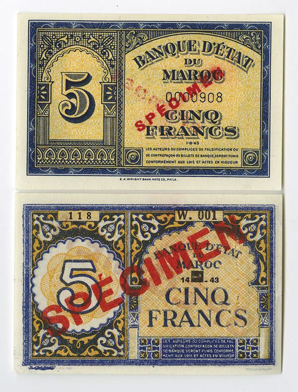 Morocco, pair of specimen 5 Francs, P-24s, S/N 0000908; and P-33s, S/N W.001 118, both overprinted SPECIMEN and dated 1-8-43. Gem Uncirculated. Rare in this form.