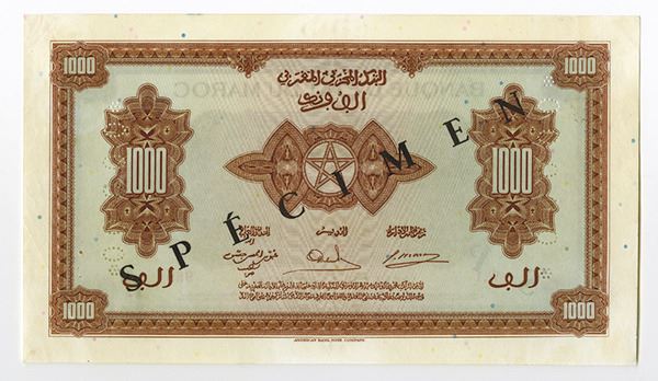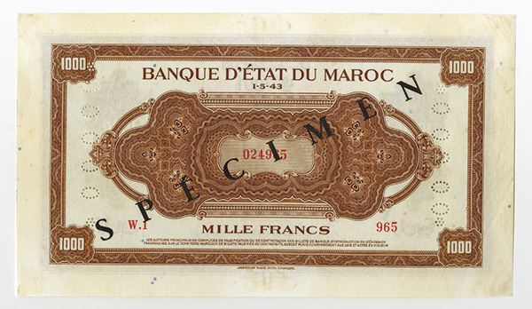Morocco, specimen 1000 Francs, P-28s, overprinted SPECIMEN, perforated S/N *00000*, and dated 1-5-43. Choice Very Fine with foxing and staining in margin. Rare in this form.