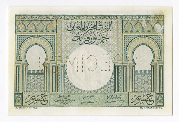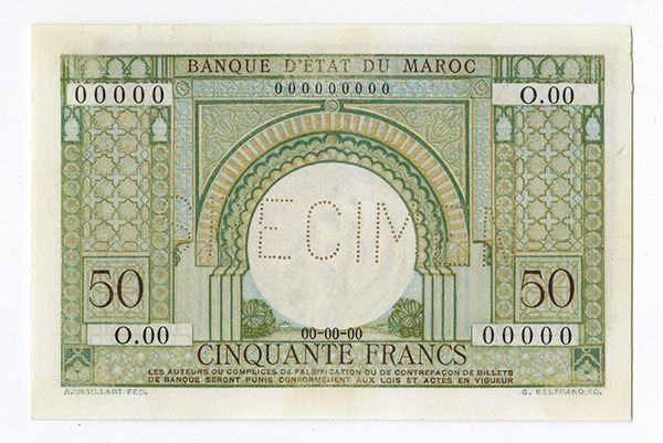 Morocco, specimen 50 Francs, P-44s, overprinted SPECIMEN, S/N O.00 000000000, and dated 00-00-00. Extra Fine with glue traces due to previous mounting. Rare in this form.