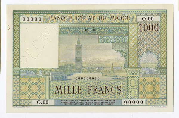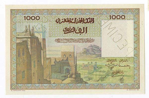 Morocco, specimen 1000 Francs, P-47s, twice perforated SPECIMEN, S/N O.00 000000000, dated 00-0-00. Choice Uncirculated. Rare in this form.