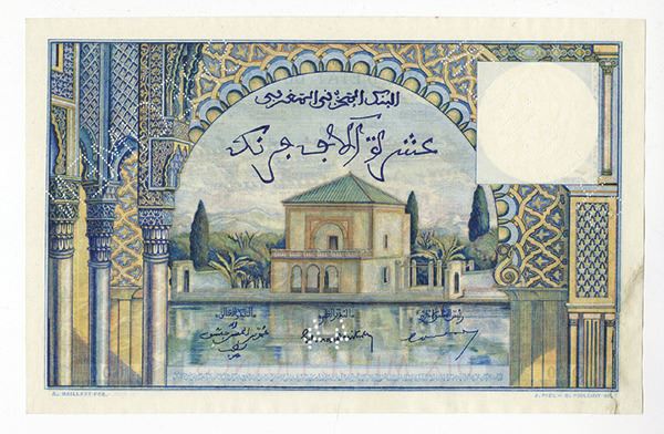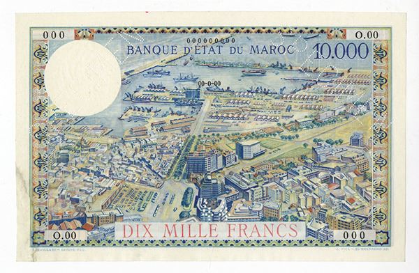 Morocco, specimen 10000 Francs, P-50s, twice perforated SPECIMEN, S/N O.00 000000000, and dated 00-0-00. Extra Fine with 1" repaired tear in left margin. Rare in this form.