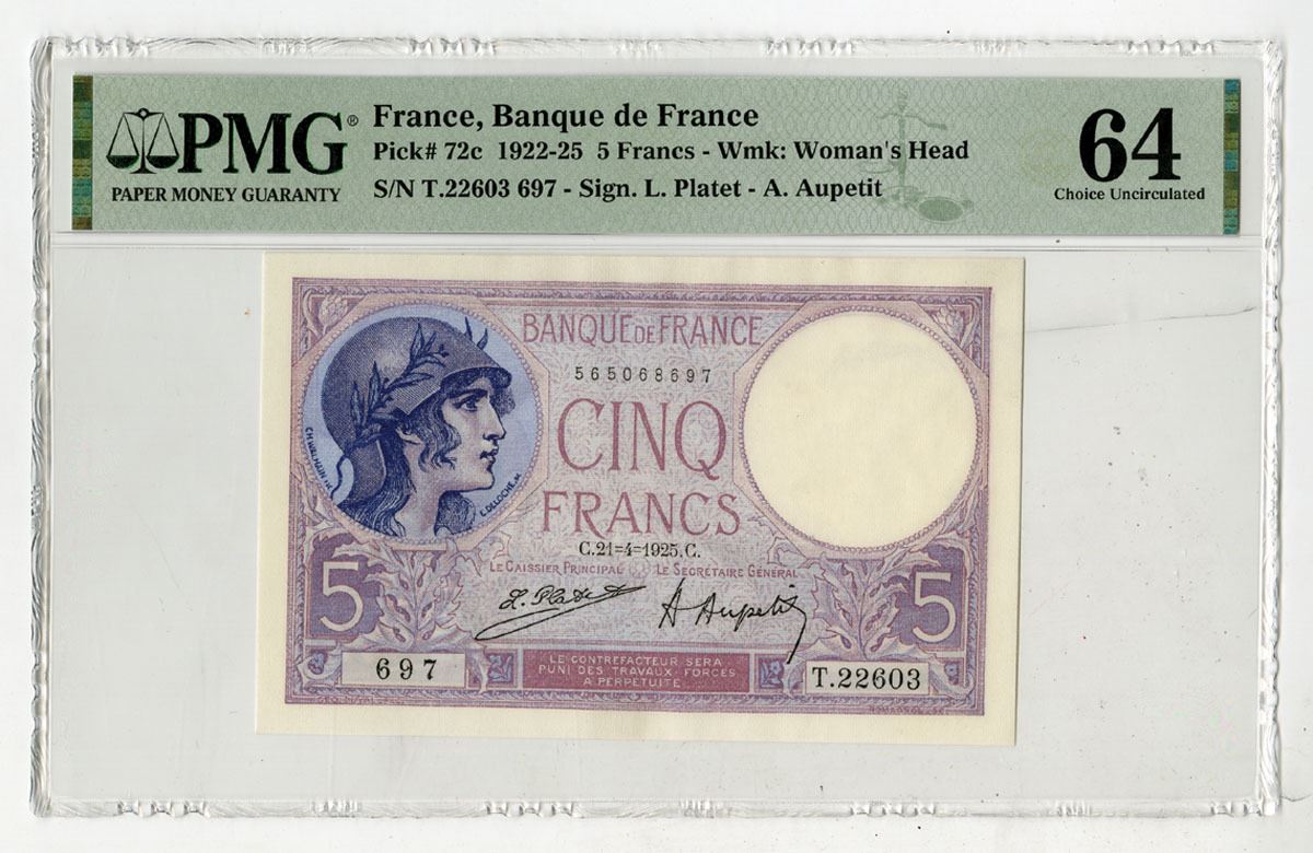 France, 1925. 5 Francs, P-72c, Issued Banknote, Lilac printing with woman earing helmet at top left, Back is lilac and blue with dock worker at right, S/N T.22603 697, PMG graded Choice Uncirculated 64.