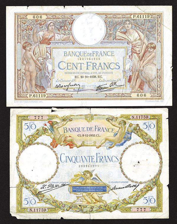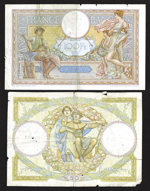 France. 50, 100 France. P-80a; 86b. Nice large format notes. First is VG-Fine second Fine-VF with some edge roughness. 2 pieces.