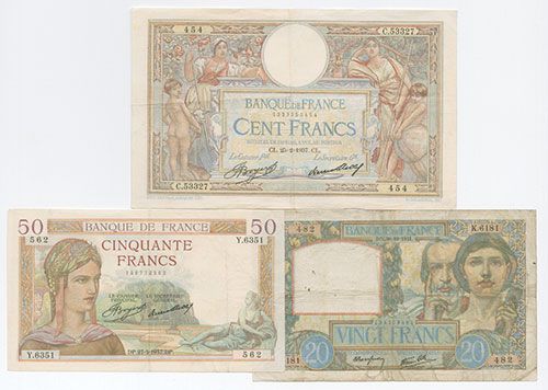 France. Lot of 3 notes. Includes 1937, 100 Francs, P-78c, Boyer Signature, VF; 1937, 50 Francs, P-85a, Boyer Signature, VF to Choice VF; and, 1941, 20 Francs, P-92b, Choice Fine. Scarce and attractive French trio.