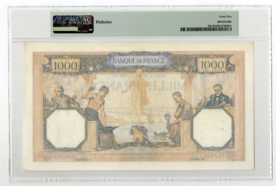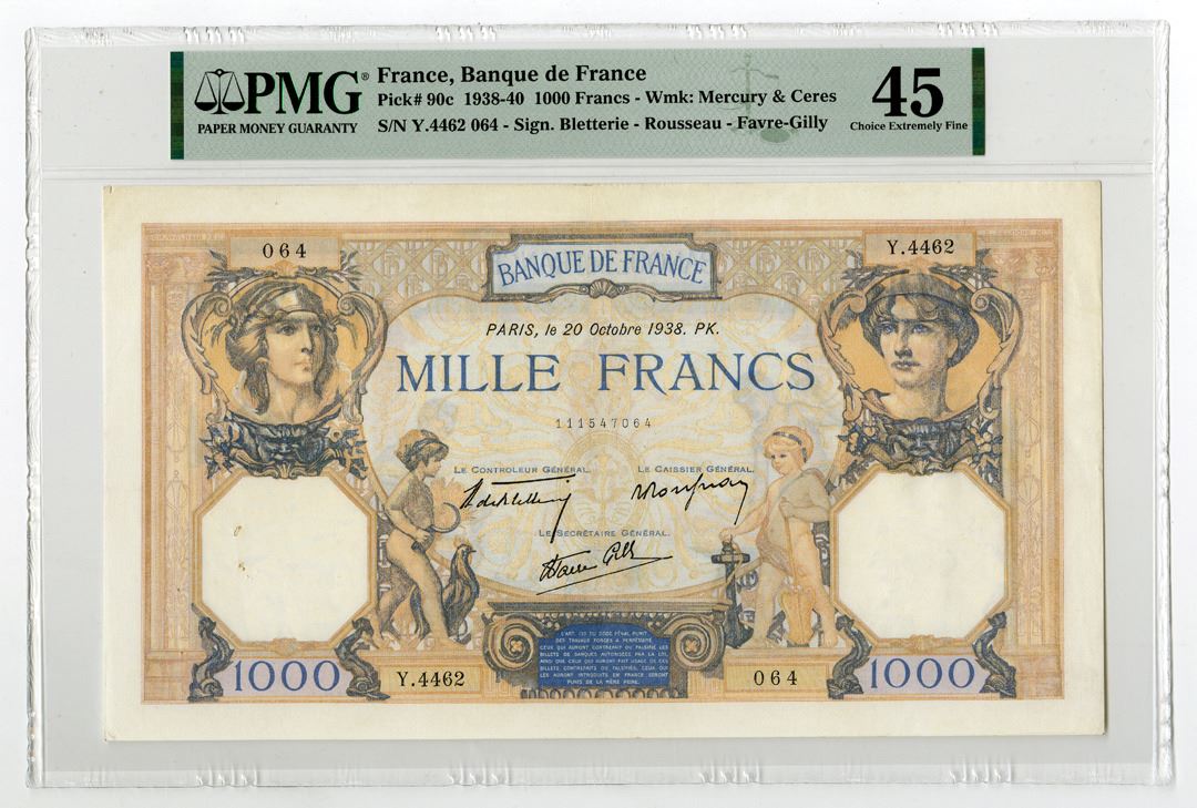 France. 1938. 1000 Francs, P-90c, Issued banknote, Multicolor, S/N Y.4462 064, Watermark: Mercury & Ceres, Sign. Bletterie - Rousseau - Favre-Gilly, PMG graded Choice Extremely Fine 45 with comment "Pinholes."