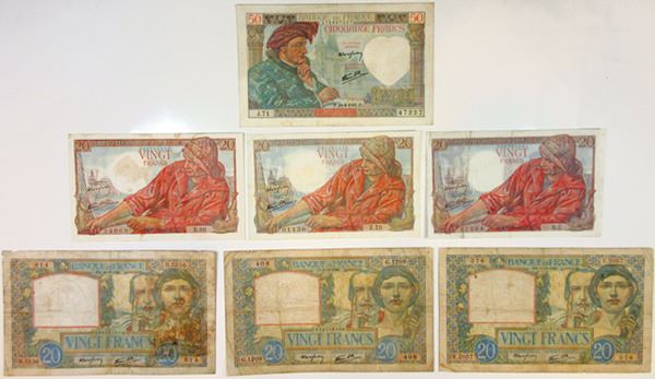 France. Lot of 7 notes, Includes 1940 & 1941, 20 Francs, P-92a (1) and P-92b (2), all issued in Fine with multiple pin holes and a couple small tears; 1941, 50 Francs, P-93, VF to Choice VF; and 1942-1943, 20 Francs, P-99a, VF to Choice VF. (7)