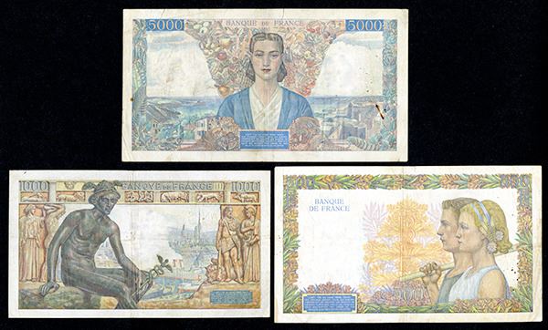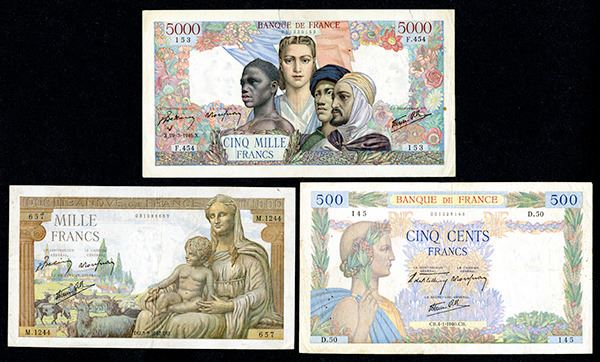 France. 500, 1000, 5000 Francs. P-95a; 102; 103c (two edge tears as top and 3 small holes). The 500 and 1000 are Fine and Very Fine, the 5000 Very Fine with some issues. Large format notes with bold designs. 3 pieces.
