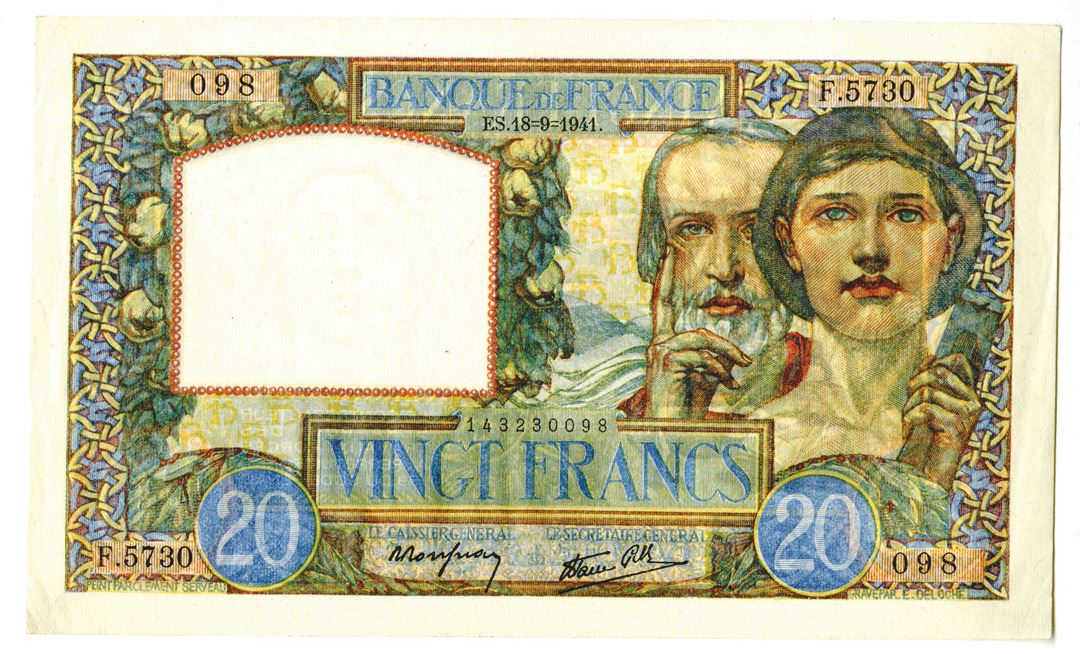 France. 1941. 20 Francs, P-92b, issued banknote, S/N F.5730-098, PMG graded About Uncirculated 50. (From the Allen Berk Collection)