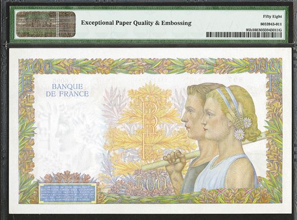 France, 500 Francs, P-95b, Issued banknote, Blue, green and m/c, Sign. Belin - Rousseau - Favre-Gilly, PMG graded Choice About Uncirculated 58 EPW. Attractive note rarely seen this nice.