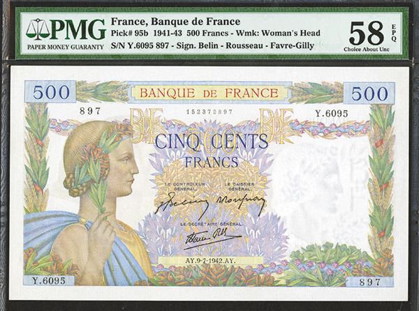 France, 500 Francs, P-95b, Issued banknote, Blue, green and m/c, Sign. Belin - Rousseau - Favre-Gilly, PMG graded Choice About Uncirculated 58 EPQ. Attractive note rarely seen this nice.