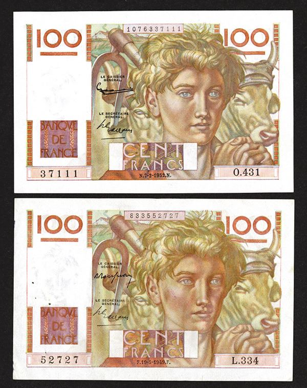 France. 100 Francs. P-128b, d. Youthful farmer with two oxen. 19.5.1949, 7.2.1952. First is Very fine with two staple holes at left end, second is Choice About Uncirculated. 2 pieces.