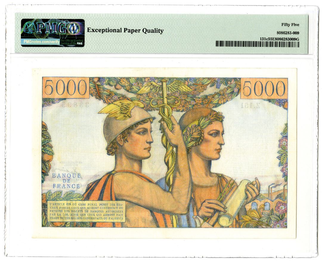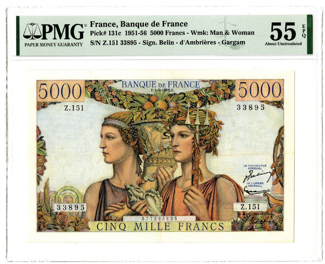 France. 1951-56. 5000 Francs, P-131c, Issued banknote, Multicolor, S/N Z.151 33895 - Sign. Belin - d'Ambrieres -Gargam, Watermark: Man & Woman, PMG graded About Uncirculated 55 EPQ.