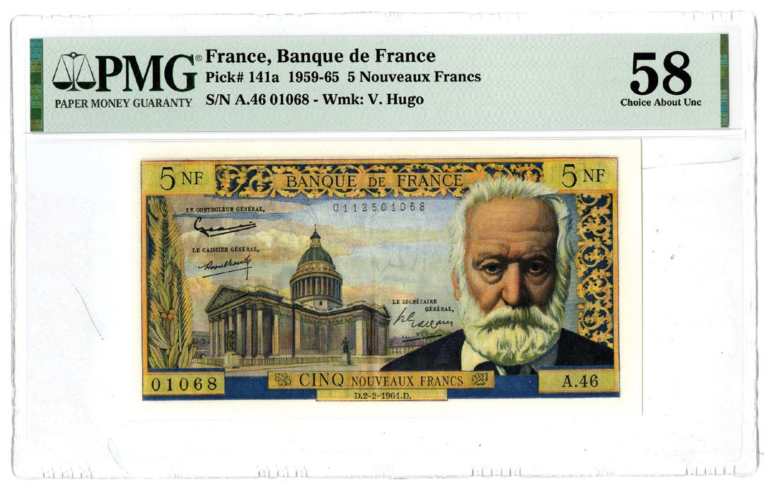 France. 1959-65. 5 Nouveaux Francs, P-141a, Issued banknote, Blue and yellow, S/N A.46 01068, Watermark: V. Hugo, PMG graded Choice About Uncirculated 58.