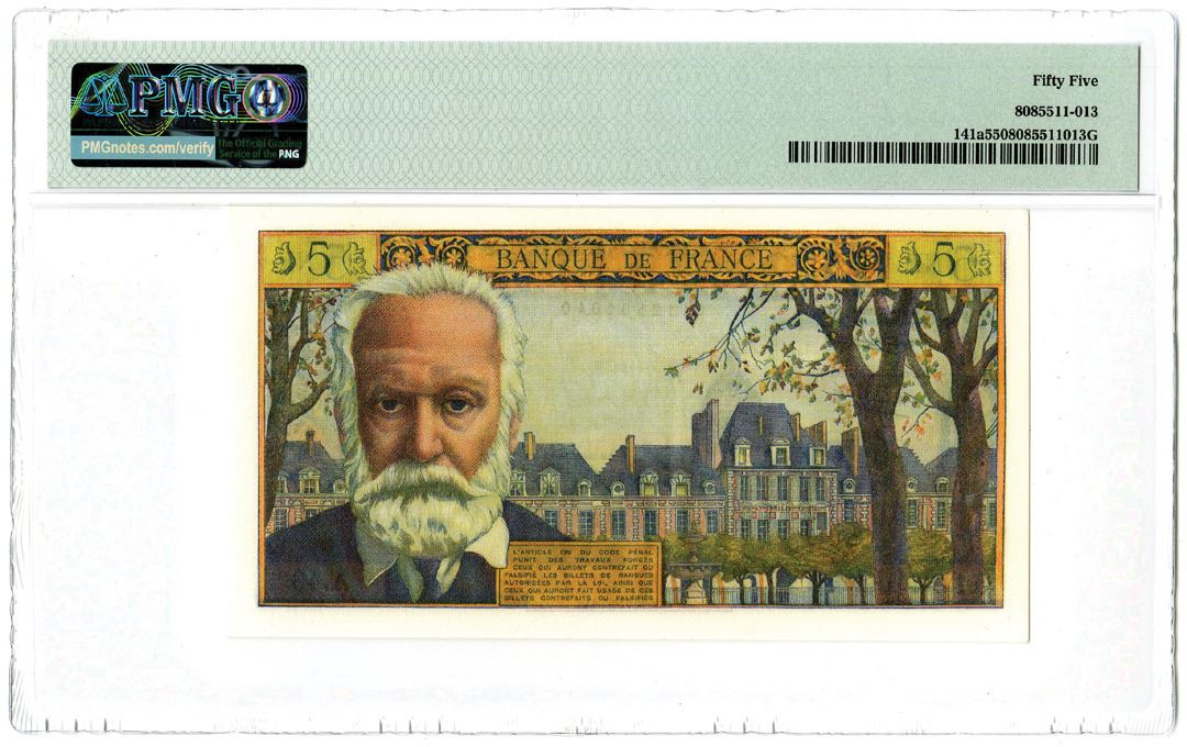France. 1959-65. 5 Nouveaux Francs, P-141a, Issued banknote, Blue and yellow, S/N A.46 01040, Watermark: V. Hugo, PMG graded About Uncirculated 55.