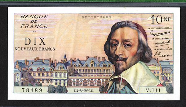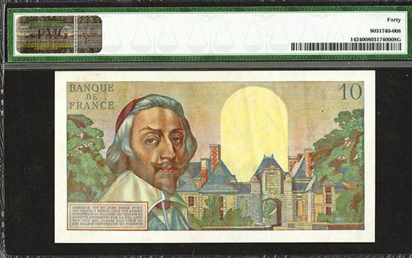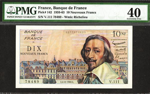 France. 10 Nouveaux Francs. P-142a. Cardinal Richelieu on both sides. PMG graded Extremely Fine 40.