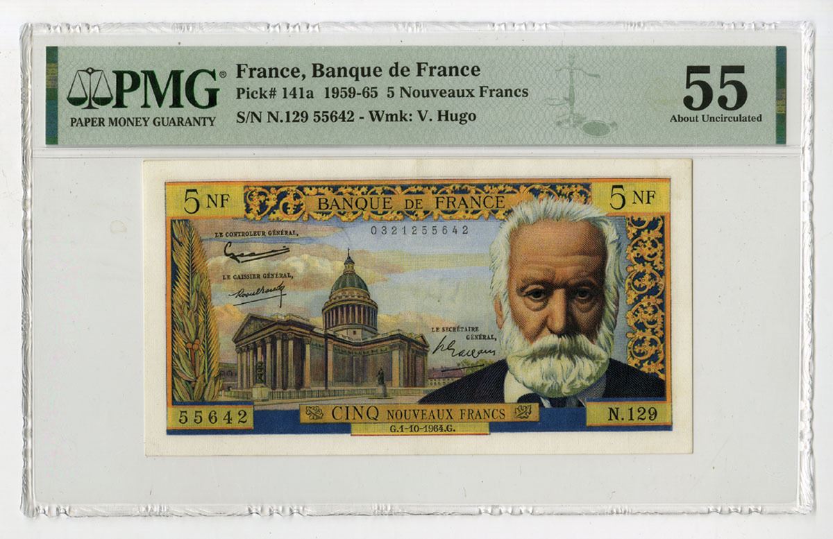 France, 1964. 5 Nouveaux Francs, P-141a, Issued Banknote, Blue, orange and m/c with Pantheon in Paris at left and Victor Hugo at right, Watermark of Victor Hugo, S/N N.129 55642, PMG graded About Uncirculated 55.