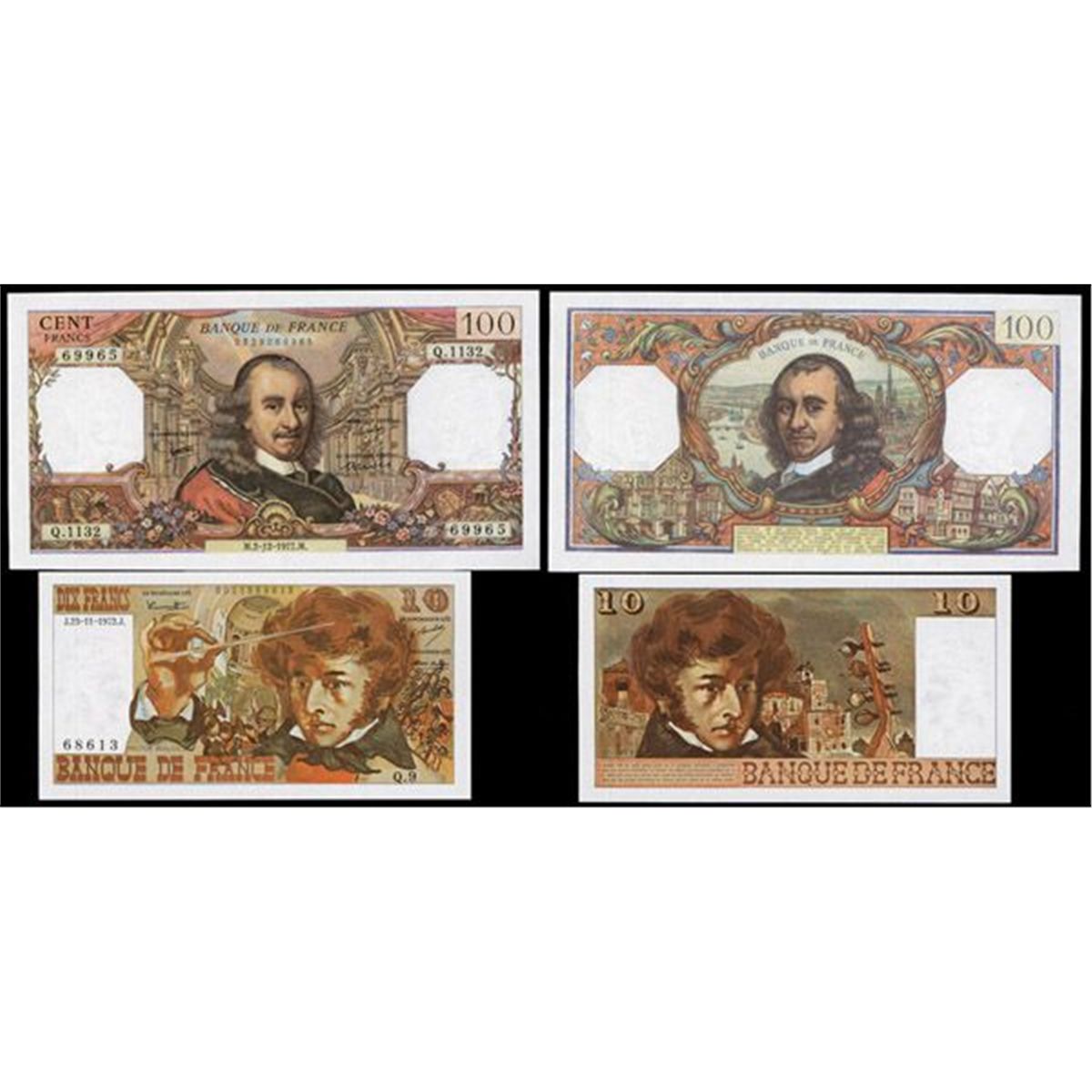 France, Lot of 2 notes, Includes 1977, 100 Francs, P-149f, Issued, Corneille at center, AU condition; and, 1972, 10 Francs, P-150a, Berloiz at right, Issued, Unc.. Attractive French banknote pair.