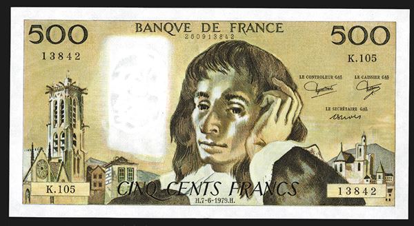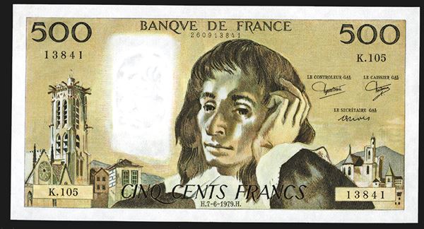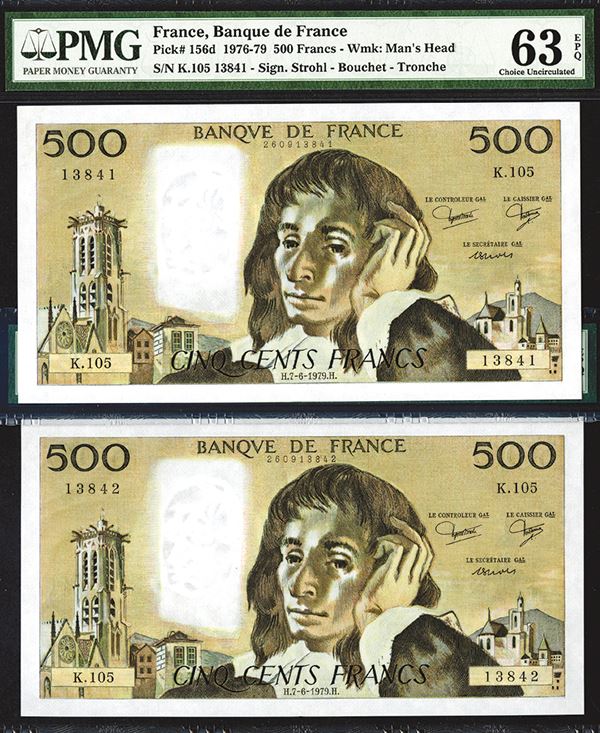 France, Lot of 2 notes both are sequential, 500 Francs, P-156d, Issued banknotes, Both are PMG graded Choice Uncirculated 63 EPQ, Very attractive notes that appear Gem.