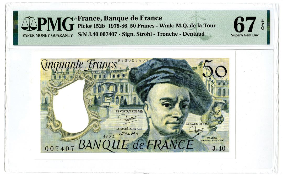 France, 1979-86. 50 Francs, P-152b, Issued Banknote. Deep blue-black on m/c underprint with portrait of Maurice Quentin de la Tour at center and Versailles at left. S/N J.40 007407 with watermark of de la Tour. PMG graded Superb Gem Uncirculated 67 EPQ.