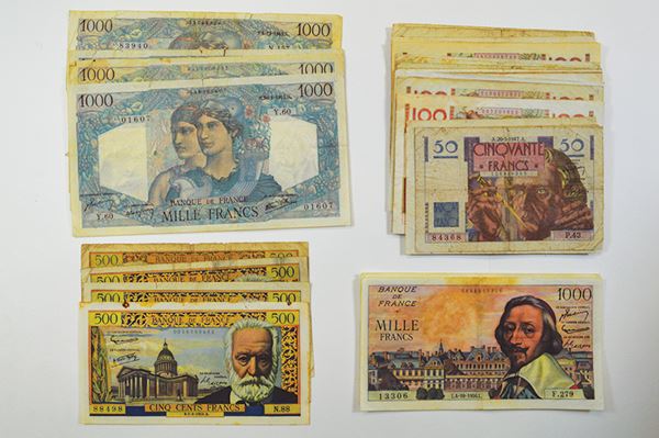 France. 1945-1958. 50, 100, 500, 1000 Francs, SCWPM 127, 128, 129, 130. 31 pcs; 500, 1000 Francs, 133, 134. 7 pieces. Generally Very Good, some with stains, paper loss. 38 pieces.
