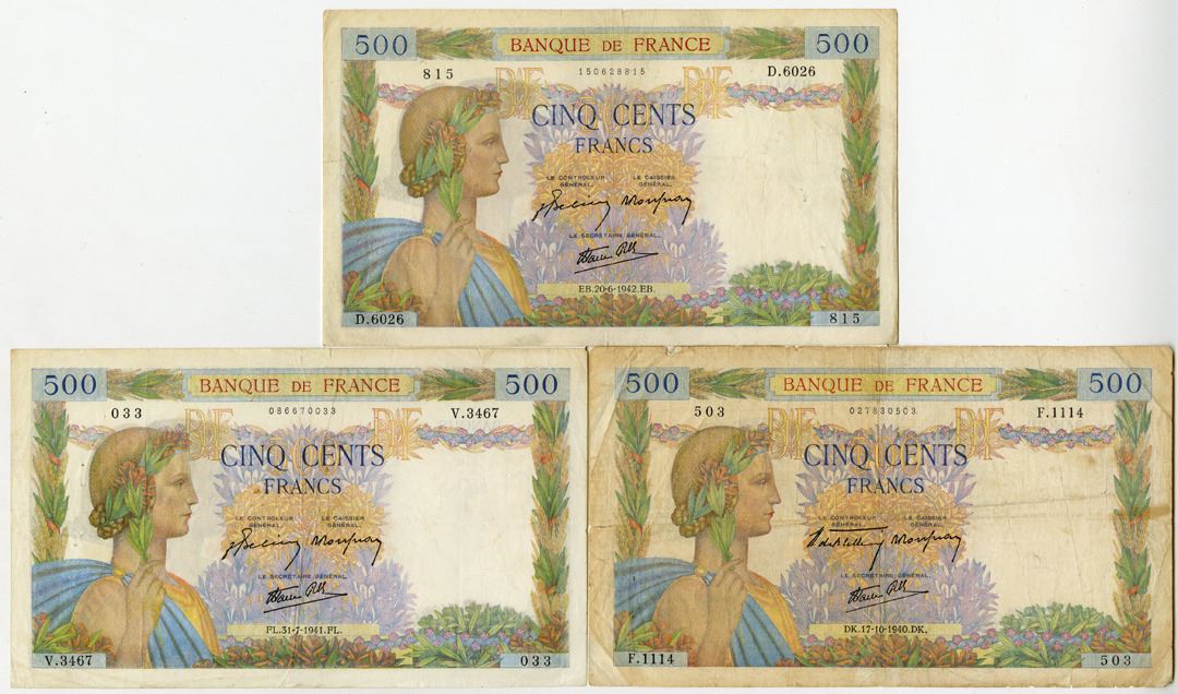 France, 1940-42. 500 Francs, P-95a and P-95b (2). All 3 notes are green, lilac and m/c with Pax wearing wreath at left. Notes are Fine-VF condition. Sold "AS IS" no returns accepted. (3).