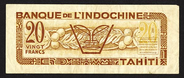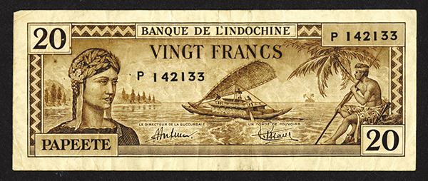 Tahiti. 20 Francs. P-20a. Nice south pacific sailing boat scene at center. Very Fine.