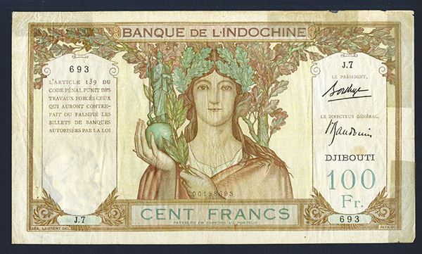 French Somaliland. 100 Francs. SCWPM 8. Female at center holding statue of Athena. Large format note. Nice Fine+ but for tape repairs at right margin.