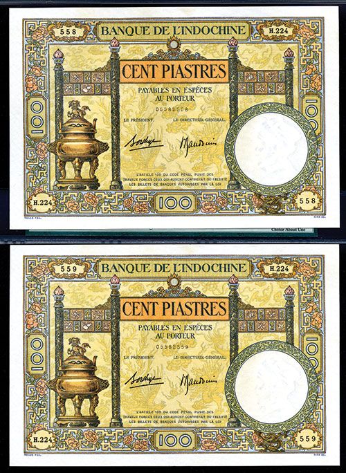 Lot of 2 notes, both the same note with sequential serial numbers, 100 Piastres, P-51d, Signature #9, S/N H.224 558 and H.224 559, Multicolor, Golden vessel with dog on top left, back with bust statue of Dupleix, Both are PMG graded Choice About Uncirculated 58, amazing pair notes rarely found this nice, but unfortunately each has an extremely light vertical center bend from being folded at some point due to the large size of the note. Both have amazing color, jumbo even borders and excellent paper quality and appear Choice Uncirculated in appearance. A trophy pair of notes that will enhance any advanced collection. These are the only two notes from this series graded in the PMG census.