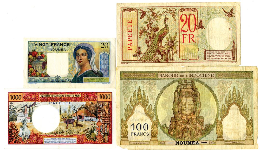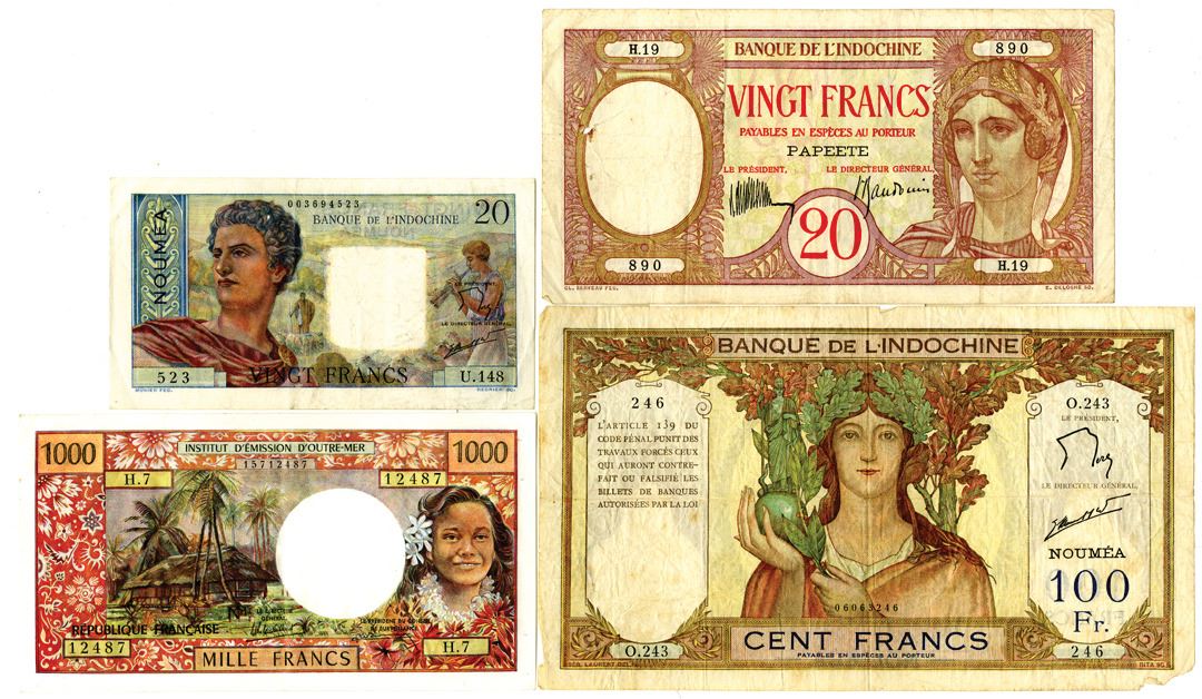 Tahiti.... Banque de L'Indochine 20 Francs, ND(1951-63), P-21c; 20 Francs, ND(1928); P-12b; 100 Francs, ND(1939-65); P-14d; Institut d'Emission d'Oure-Mer 1000 Francs, ND(1971-85), P-27d. Notes range from VF-XF condition. (4).