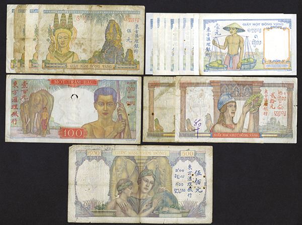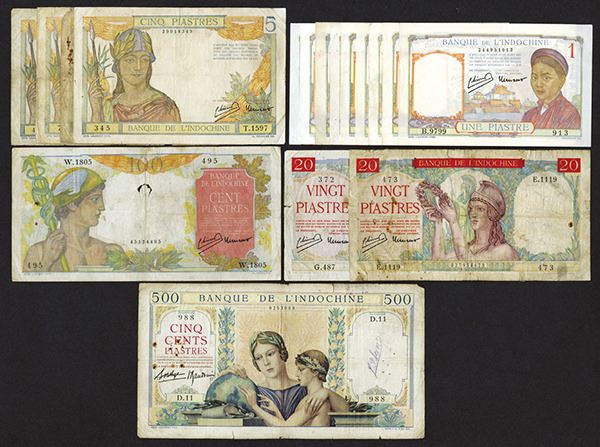 French Indo-China. 1, 5, 10, 20, 100, 500 Francs. Very good or so. 17 pieces, one with a Viet Nam hand stamp.