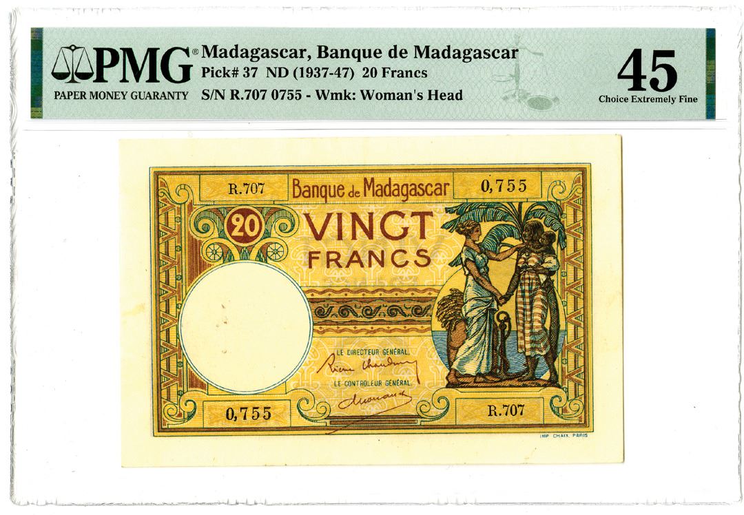 Madagascar. ND (1937-47). 20 Francs, P-37, Issued Banknote. Yellow-brown printing with allegory of France and African woman with child at right. S/N R.707 0755 with watermark of a woman's head. PMG graded Choice Extremely Fine 45 with comment "pinholes."