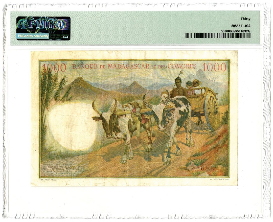 Comoros. ND (1963). 1000 Francs, P-5b, Issued banknote, Yellow and green, S/N W.726 346 - Sign. Title - Dir. General Adjoint at Top, Ovpt. On Madagascar #48, PMG graded Very Fine 30.