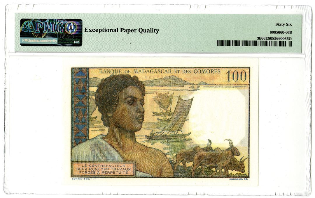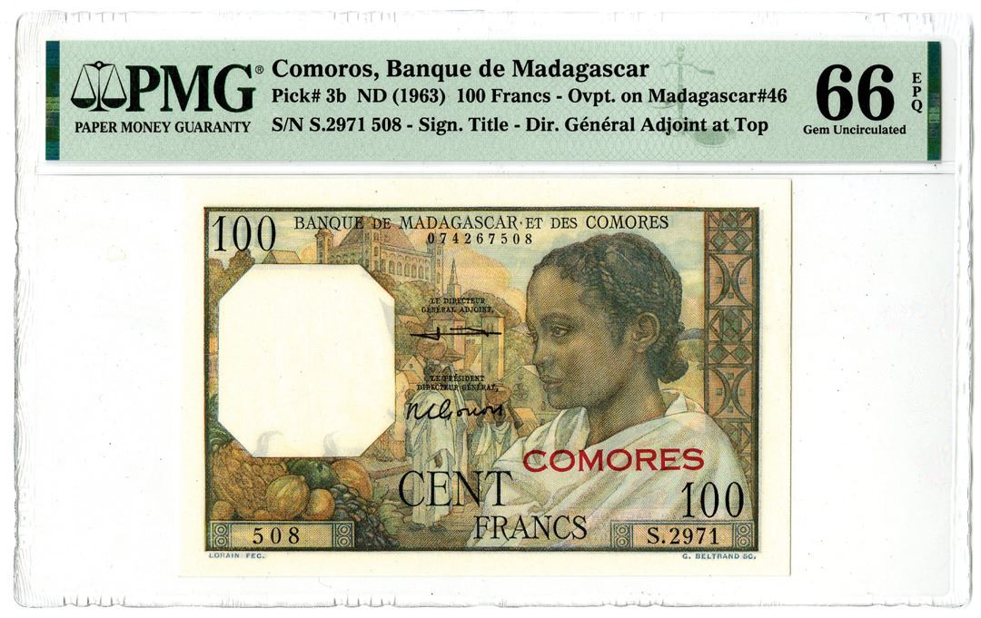 Comoros... ND (1963). 100 Francs, P-3b, Issued banknote, Brown and m/c on face, S/N S.2971 508, Overprint on Madagascar #46, Sign. Title - Dir. General Adjoint at Top, PMG graded Gem Uncirculated 66 EPQ.