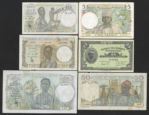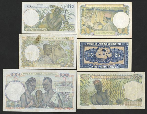 French West Africa. 5, 10, 25, 50, 100 Francs. P-21; 30a; 37; 38; 39; 40. Nicely matched group. Generally Very Fine, some with stains. 6 pieces.