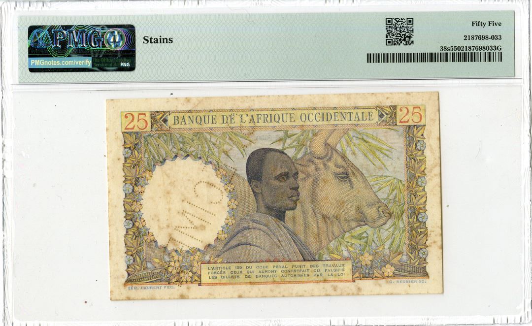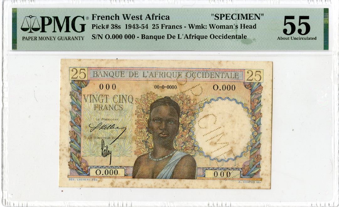 French West Africa, 1943-54. 25 Francs, P-38s, Specimen Banknote, M/c printing with woman at center, Pin punched Specimen, S/N O.000 000, PMG graded About Uncirculated 55 with comment "Stains," French Printing.