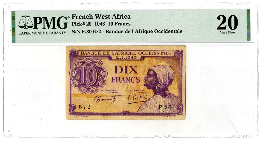 French West Africa. 1943. 10 Francs, P-29, Issued banknote, Purple and orange, S/N F.30 672, PMG graded Very Fine 20.