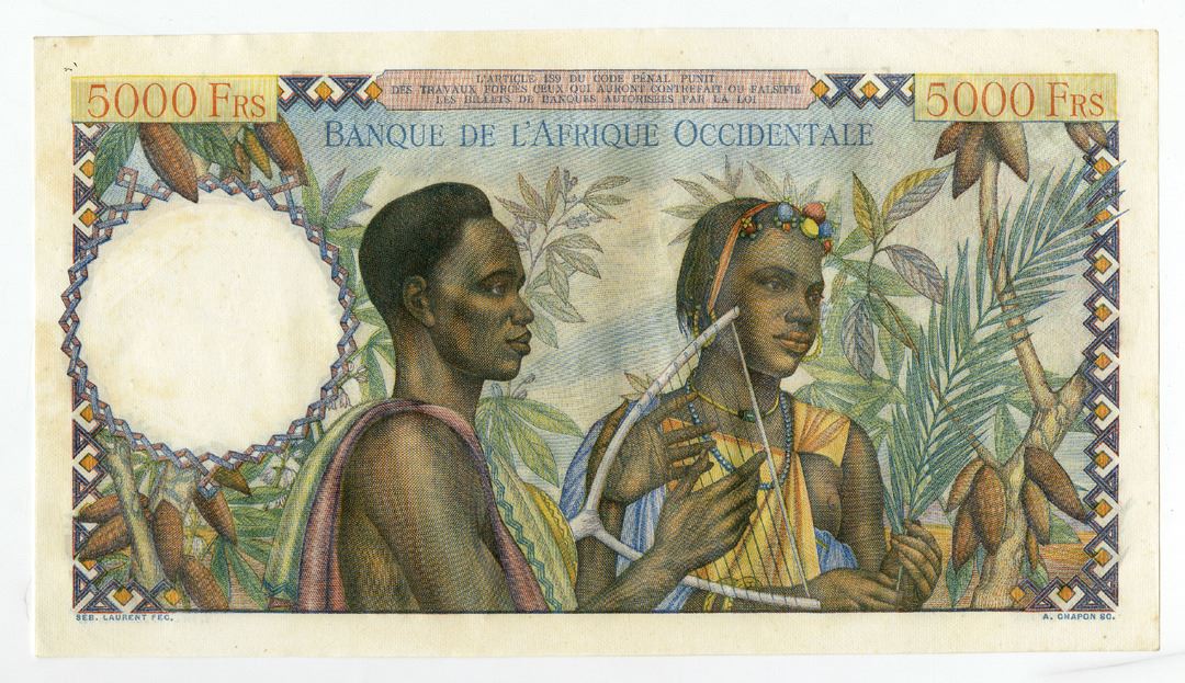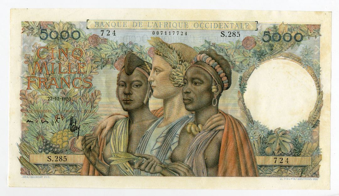 French West AfricaÉ,., 1950. 5000 Francs, P-43, Issued Banknote, M/C printing with personification of France with two local women at center, S/N S.285 724, Printer: French Printing (without imprint), Note is in XF to Choice XF condition due to creases on the left upper border. Very attractive large format note.