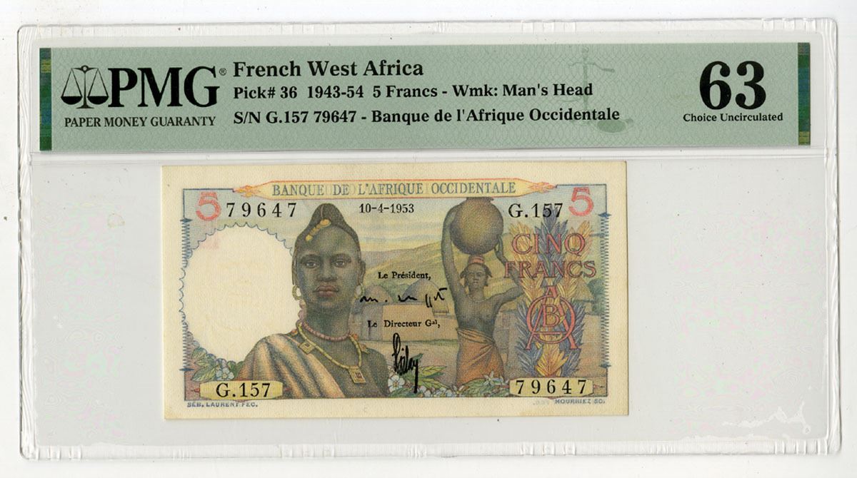 French West Africa, 1943-54. 5 Francs, P-36, Issued Banknote, Multicolor printing with 2 women on face, S/N G.157 79647, PMG graded Choice Uncirculated 63, French Printing.