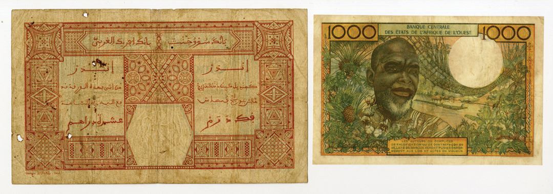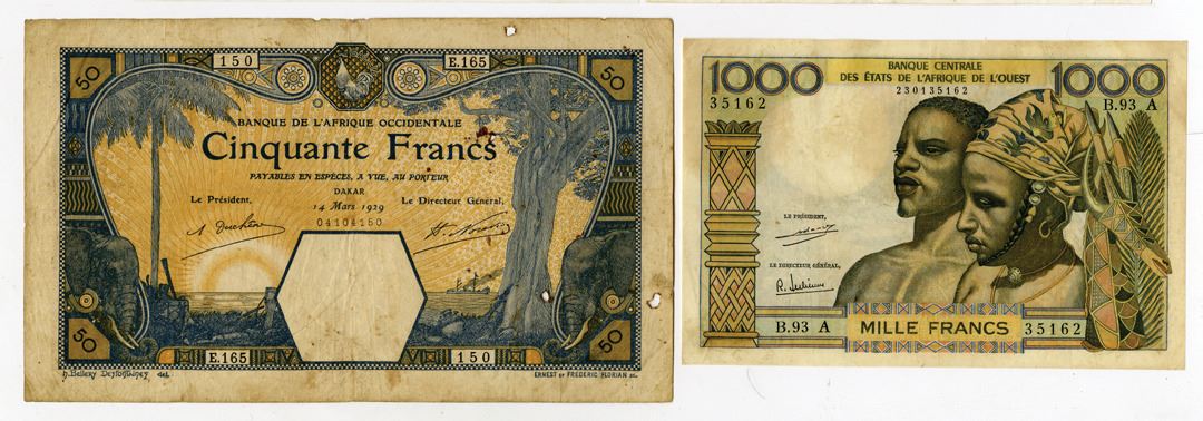 F.W.A., Pair of issued notes, includes French West Africa 50 Francs, P-9Bc, Fine with few rust holes; and West African States 1000 Francs, ND (1960s), P-103Ah, Ivory Coast issue, Very Fine. (2)