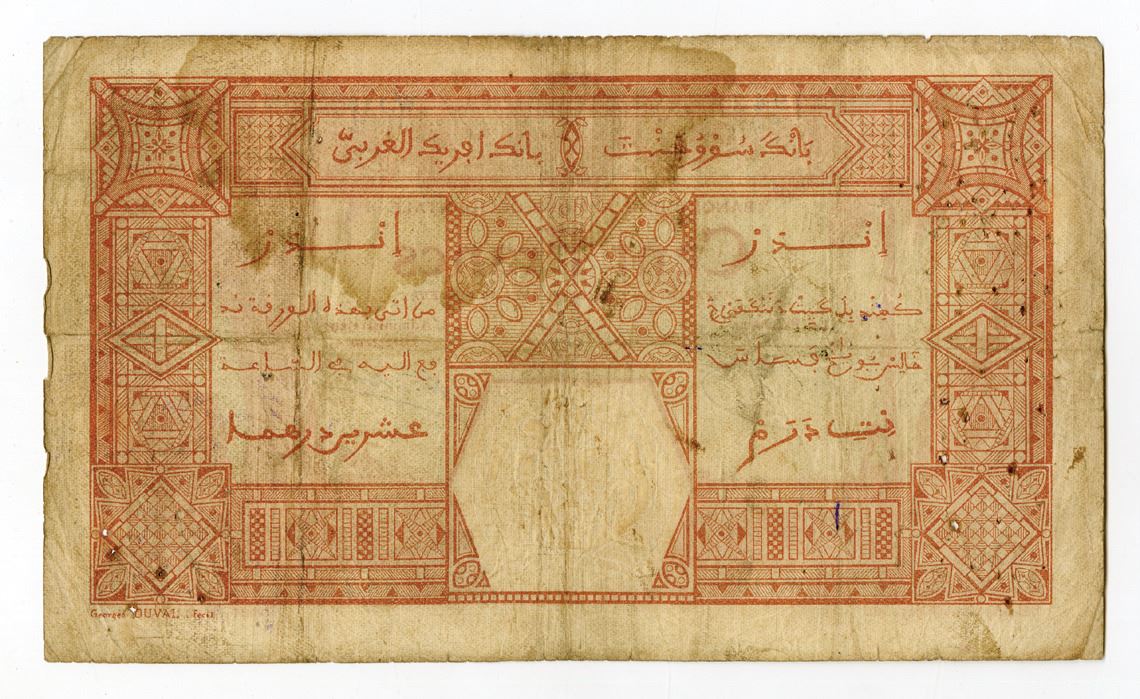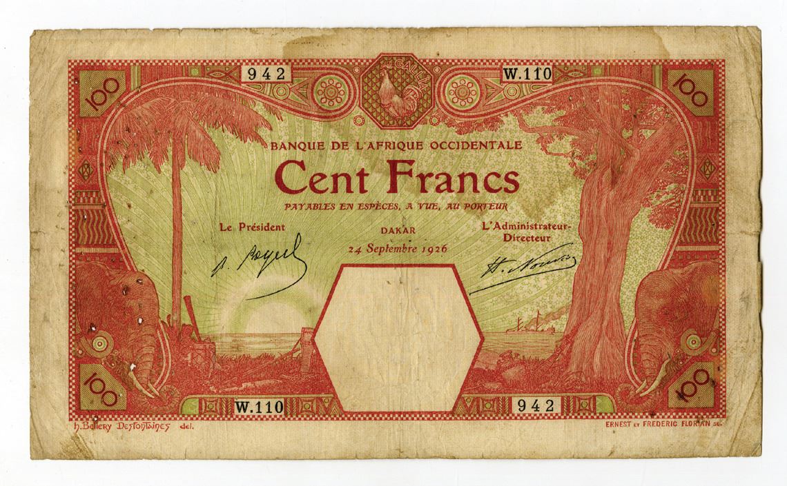 Dakar.., French West Africa, 1926. 100 Francs, P-11B, Issued Banknote, Red on green underprint with Elephant head and trees at left and right, Back is red with Arabic writing, S/N W.110 942, Fine to Choice Fine condition with light stains and multiple staple rust holes.