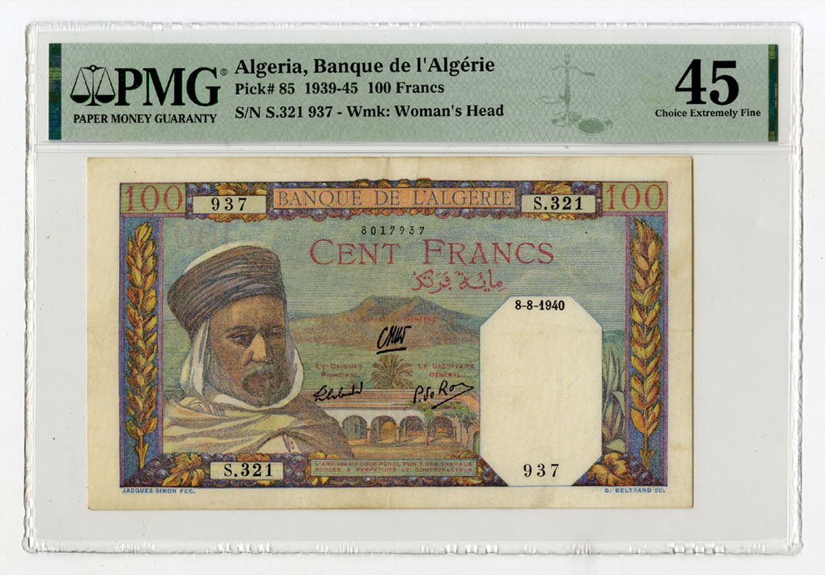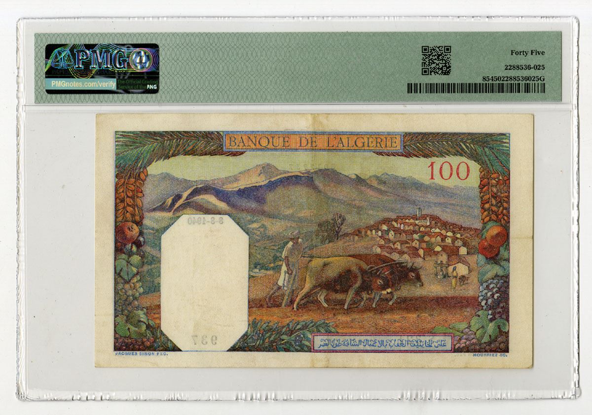 Algeria, 1939 to 1945. 100 Francs, P-85, Issued Banknote, M/c printing with Alerian man in turban at left, Back is m/c with man plowing with oxen at center, S/N S.321 937, PMG graded Choice Extremely Fine 45.