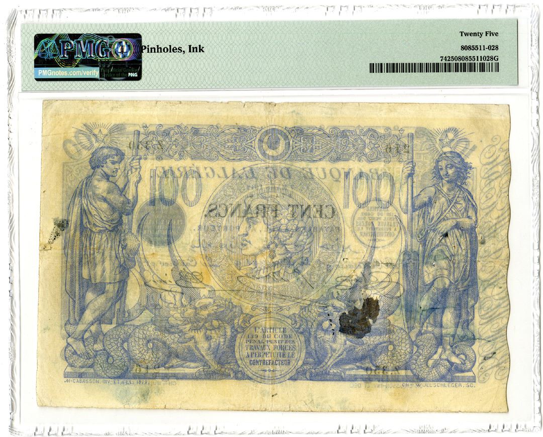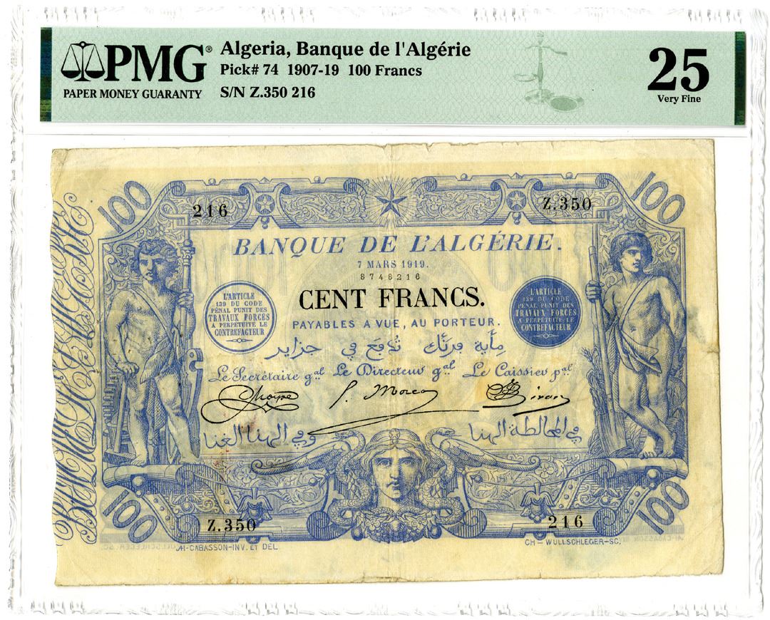 Algeria. 1907-19. 100 Francs, P-74, Issued banknote, Light blue, S/N Z.350 216, PMG graded Very Fine 25 with comments "Pinholes, Ink". Only one note grades higher out of 4 graded in the PMG census.