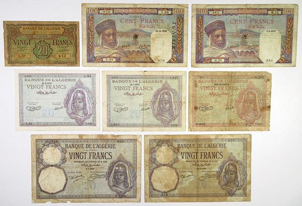 Algeria. Includes two 20 Francs, 1929, P-78b, one VG with splits, one Fine; two 100 Francs, 1939, P-85, both Fine one with 1/2" tear; three 20 Francs, 1943, P-92a, one VG, one Fine, one VF; and 20 Francs, 1948, P-103, Almost Fine.