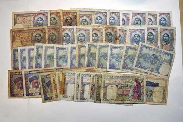 Algeria. Banque de l'Algerie. 5 Francs P-77 (35); 20 Francs, P-78 (10), P-92 (9); 50 Francs, P-80a (2); 100 Francs P-81b; 50 Francs P-84 (7) P-87 (2); 100 Francs P-85 (3), P-88; Mostly Fair-Good, some of the 5 Francs better. Total of 69 pieces.