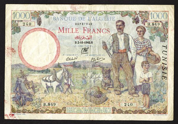 Tunisia. 1000 Francs. P-20b. Farm family standing at right end. BANQUE DE ALGERIE text repeated as watermark. Nice large format note. With several impressions of a red inked fingerprint in margins. Fine.