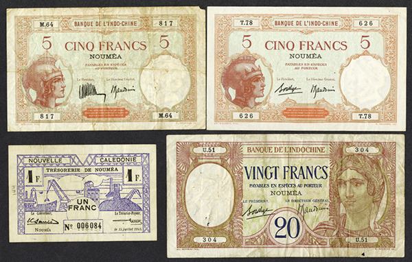 New Caledonia. 1, 5, 20 Francs. P-36b (both signature varieties); 37b; 52. Fine to Very Fine, mostly the former. 4 pieces.